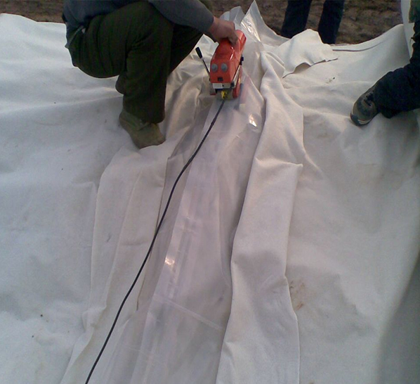 土工布作為土工膜的保護層,使保護防滲層不受損壞。為減少紫外線照射,增加抗老化性能,最好采用埋入法鋪設。施工中,首先要用料徑較小的砂土或粘土找平基面,然后再鋪設,鋪設時不要繃得太緊,兩端埋入土體部分呈波紋狀,最后在所鋪的兩布一膜上用細砂或粘土鋪一層10cm左右過度層。砌上20-30cm塊石(或砼預制塊)作防沖保護層。施工時,應盡力避免石塊直接砸在上,最好是邊鋪膜邊進行保護層的施工。兩布一膜與周邊結(jié)構(gòu)物連接應采用膨脹螺栓和鋼板壓條錨固,連接部位要涂刷乳化瀝青(厚2mm)粘接,以防該處發(fā)生滲漏。施工接縫處理是一個關(guān)鍵工序,直接影響防滲效果。一般接縫方式有:①搭接:搭接寬度宜大于15cm;②熱焊:宜于稍厚的土工膜基材,焊縫搭接寬度不小于5CM.(不推薦膠接,長時間水浸泡易開膠,防滲效果差.) 。